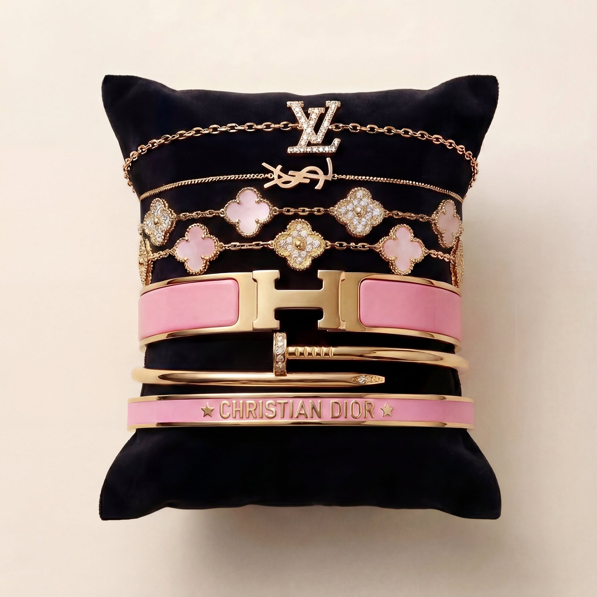 Questo pacchetto completo include ogni bracciale mostrato — un mix perfettamente bilanciato di tonalità dorate, smalto rosa e dettagli luccicanti che elevano qualsiasi outfit. Progettato per un layering senza sforzo e un look di impatto che parla di lusso.